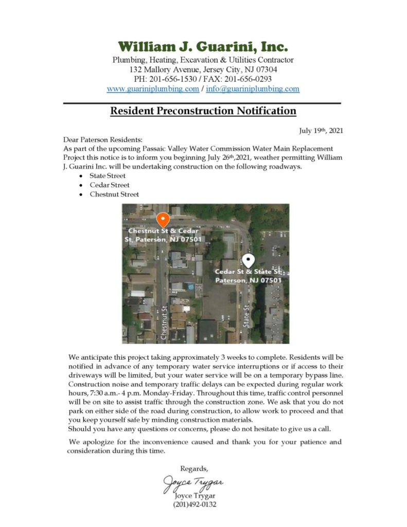 Starting Monday, July 26th, 2021, Guarini Inc. will start a water main replacement project in Paterson on Cedar Street between Chestnut Street and State Street, and on State Street between Cedar Street and 20th Avenue. All services will remain working unless otherwise noted.