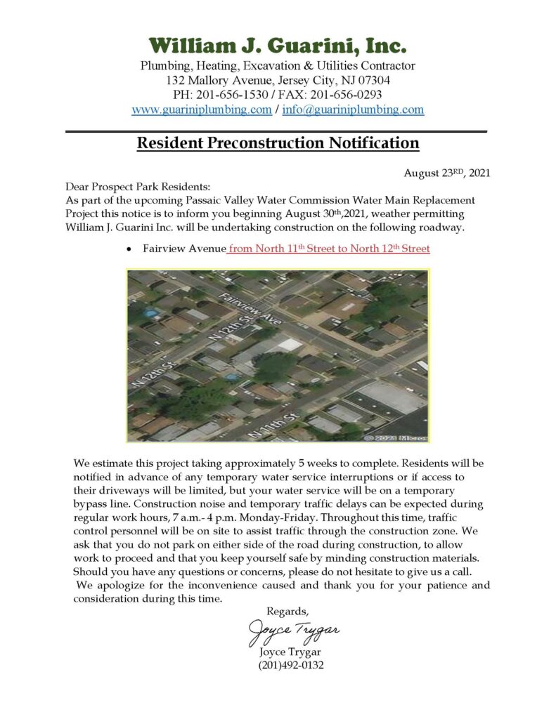 Starting Monday, August 30th, Guarini Inc. will start a water main replacement project on Fairview Avenue (between N 11th St and N 12th St) in Prospect Park.