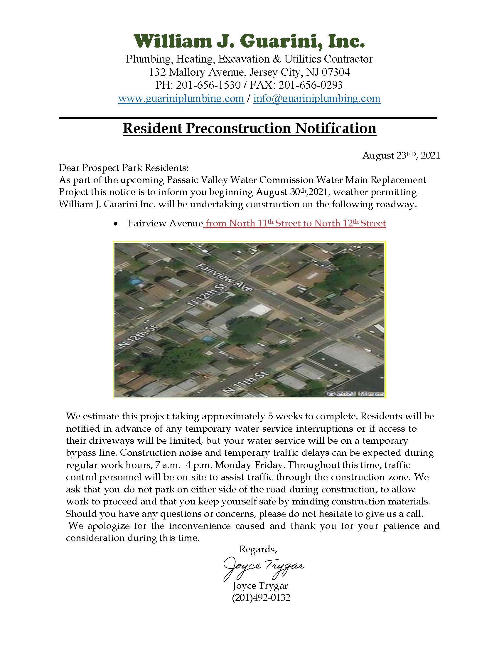 Starting Monday, August 30th, Guarini Inc. will start a water main replacement project on Fairview Avenue (between N 11th St and N 12th St) in Prospect Park.