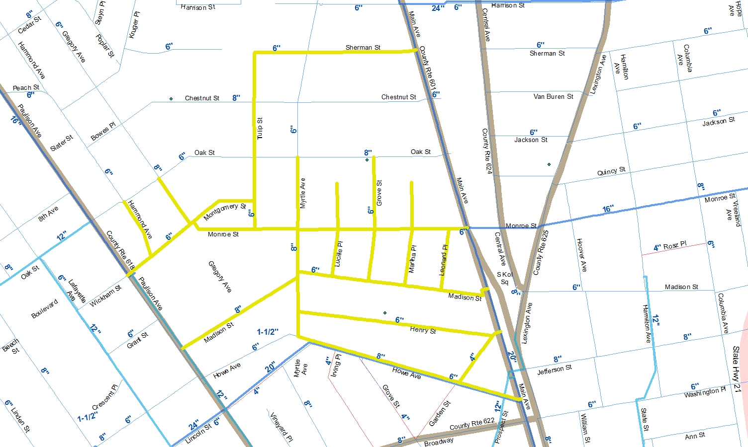 The Passaic Valley Water Commission is committed to providing our customers with high quality water and service. As part of our on-going improvement program, we are cleaning, lining, testing and disinfecting approximately 18,400 linear feet of 6 and 8-inch diameter water mains along Sherman Street, Oak Street, Monroe Street, Madison Street, Tulip Street, Myrtle Avenue, Grove Street, Lucille Place, Martha Place, Leonard Place, Henry Street, Howe Avenue, Montgomery Street, Hammond Avenue, Gregory Avenue, and Garden Street. Work will begin on or around September 11th and will be completed by December 2017. Please note that parking and access may be restricted for limited times at these locations.