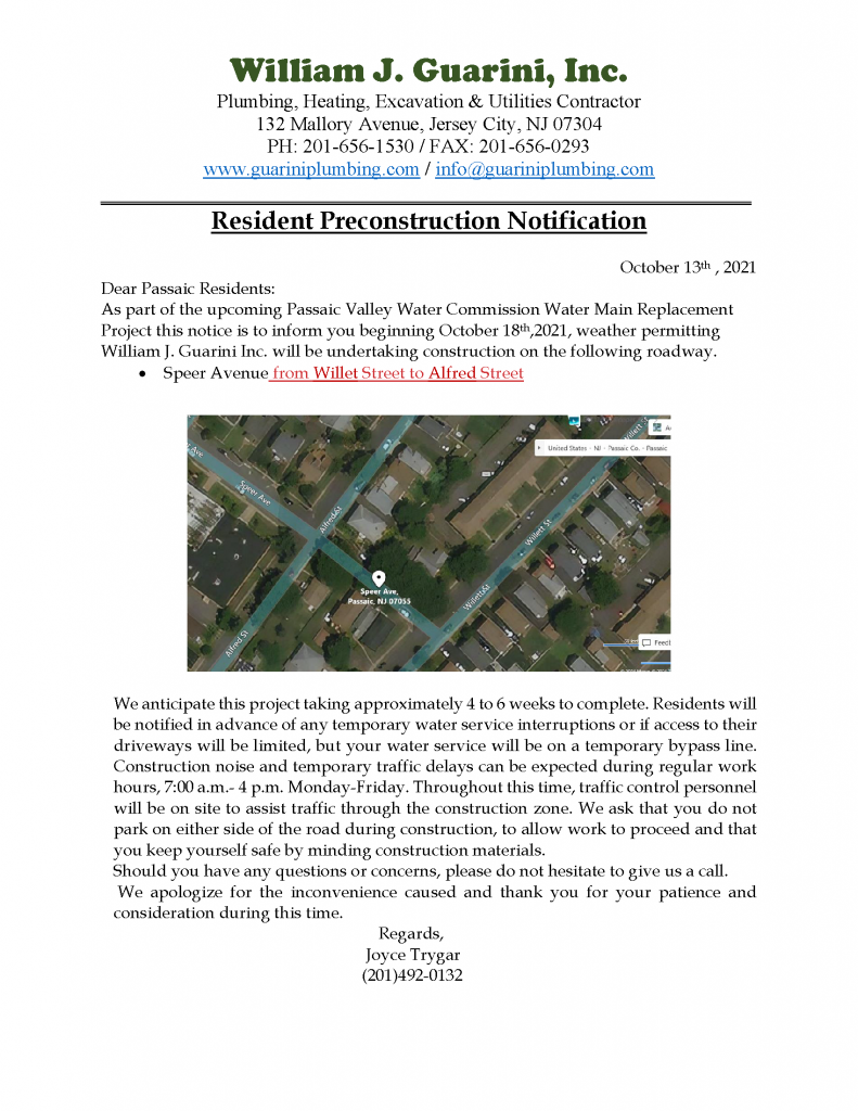 Starting Monday, October 18th, Guarini Inc. will start a water main replacement project on Speer Avenue (between Willet St and Alfred St) in Passaic.